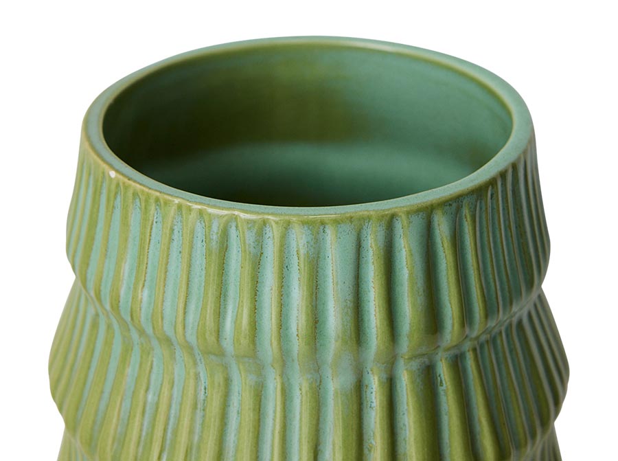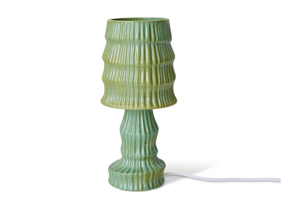 Ceramiczna lampa stołowa w kolorze zielonym. Dzięki delikatnym pionowym rowkom i rzeźbiarskiej sylwetce, ta ceramiczna lampa stołowa bawi się rytmem i powtarzalnością. Delikatne szkliwo płatków dodaje odrobinę ciepła i charakteru, a płynna tonacja kształtu tworzy jednolity, niemal monolityczny wygląd. Nowoczesny element, który sprawdzi się na półkach, kredensach i wszędzie tam, gdzie potrzeba kreatywnego blasku.