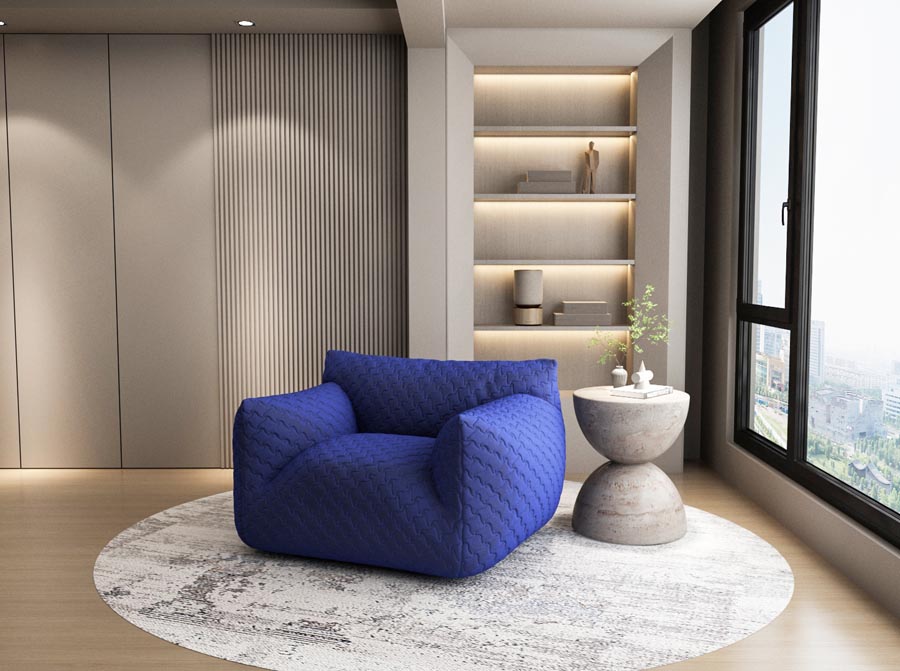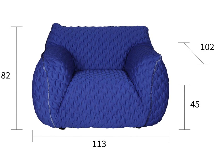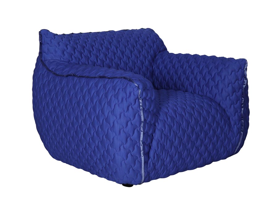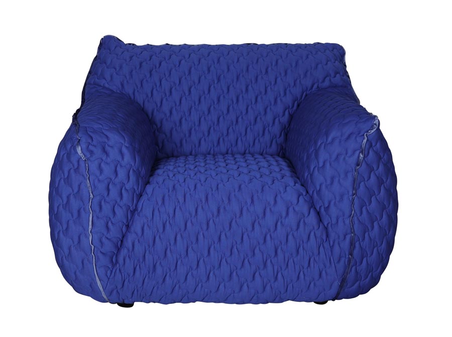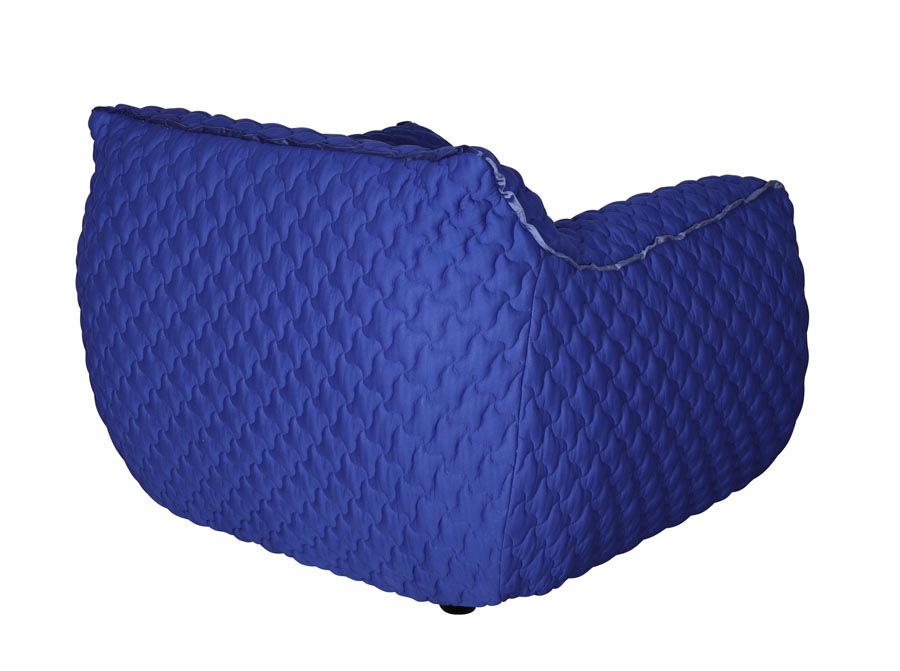 Nowoczesny, duży fotel o obłym kształcie w kolorze kobaltowym. Elastyczna tkanina w kolorze chabrowym posiada pikowania na kształt czteroramiennych gwiazd. Fotel wypoczynkowy to połączenie prostej formy z miękkim wypełnieniem z gąbki i oryginalną strukturą materiału. Fotel robi duże wrażenie we wnętrzu