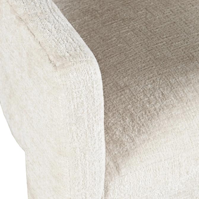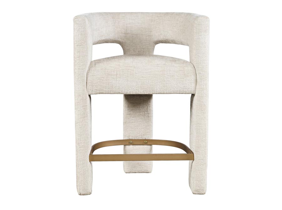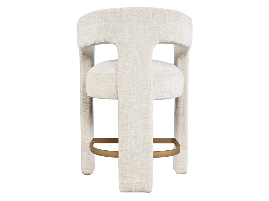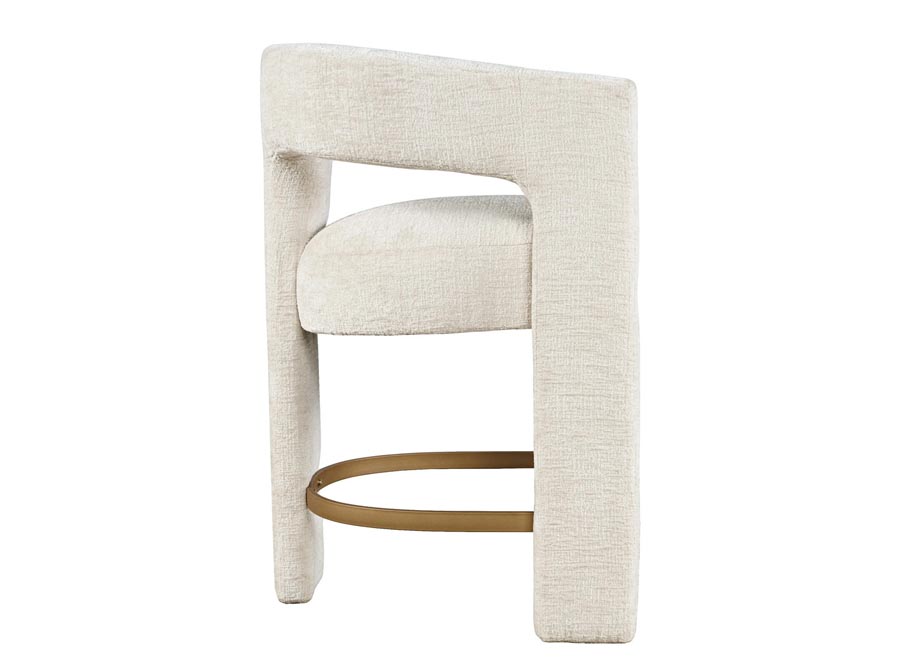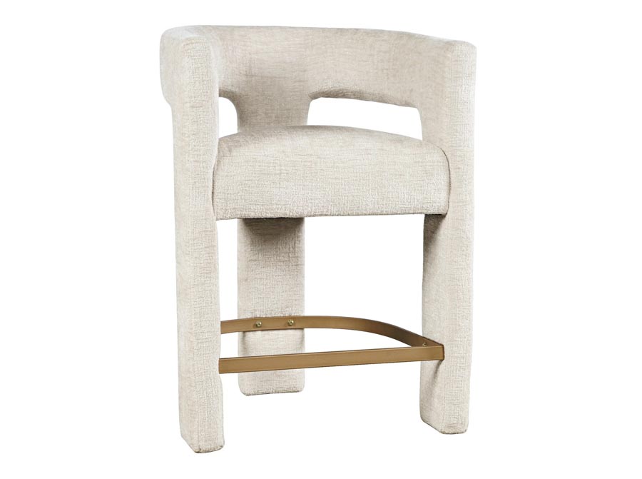 Eleganckie krzesło barowe tapicerowane w kolorze jasnobeżowym wykonane z najwyższej jakości tkaniny szenilowej. Prosta forma mebla oparta na modnych obłych kształtach wzbogaci każdą jadalnię.