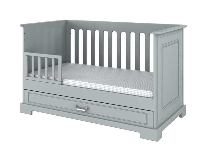 Cechy: łóżeczko dla starszego dziecka może pełnić funkcję sofy ( po wyjęciu ramki od strony szuflady), posiada trzy stopniową regulację wysokości materaca, pojemną szufladę z pięknym porcelanowym uchwytem oraz dodatkowo w wyposażeniu barierka ochronna dla dziecka (prawa bądź lewa)