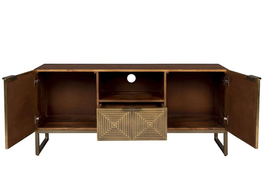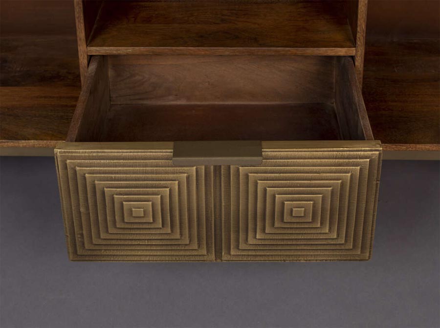 Charakterystyczne zdobienia mosiężnych frontów szuflad zwracają uwagę. Warto pokazać ten model w salonie lub sypialni. Do produkcji kredensu wykorzystano lite drewno mango, które ozdobiono wykończeniami w kolorze miodu mango. Dno szuflad wykonano z płyty MDF. Żelaznej ramie gwarantującej stabilność utrzymywania się mebla na podłodze nadano kolor antycznego mosiądzu, stosując w tym celu metodę lakierowania proszkowego.