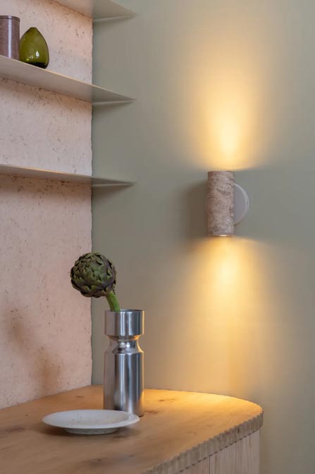 Lampa ścienna wykonana z trawertynu idealna do łazienki lub sypialni. Charakteryzuje się ciepłym, naturalnym wyglądem. Jej mineralna faktura i stonowany odcień pozwalają jej z łatwością wkomponować się w wystrój salonu, sypialni lub korytarza, dodając dyskretnego, ponadczasowego akcentu dekoracyjnego.