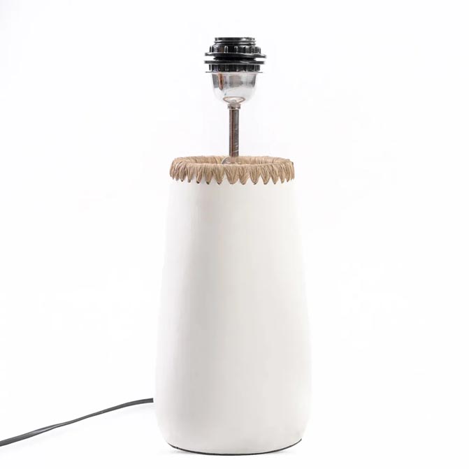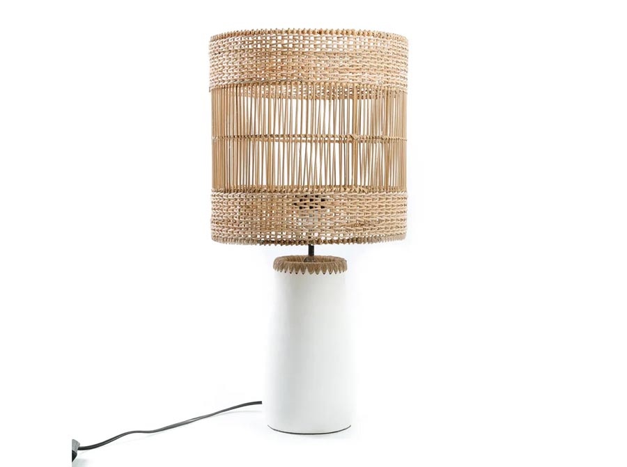 Podstawą jest czysta biała terakota z dekoracją z rafii na krawędziach. Klosz lampy wykonany jest z rattanu, a jego unikalny wzór sprawi, że świetlne wzory staną się ciekawsze i bardziej przytulne.