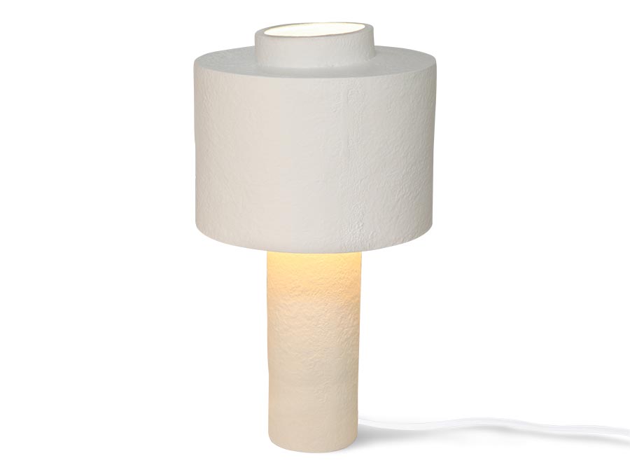 Interesująca lampa stołowa inspirowana latami 60-tymi i 70-tymi wykonana z poliżywicy i materiału gesso. Matowa o strukturalnym charakterze.
