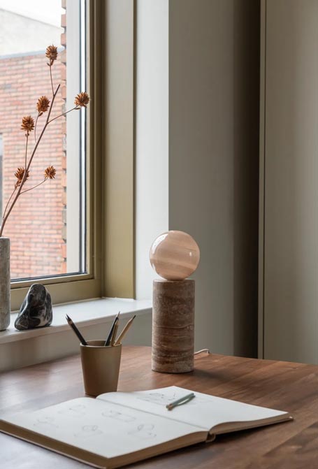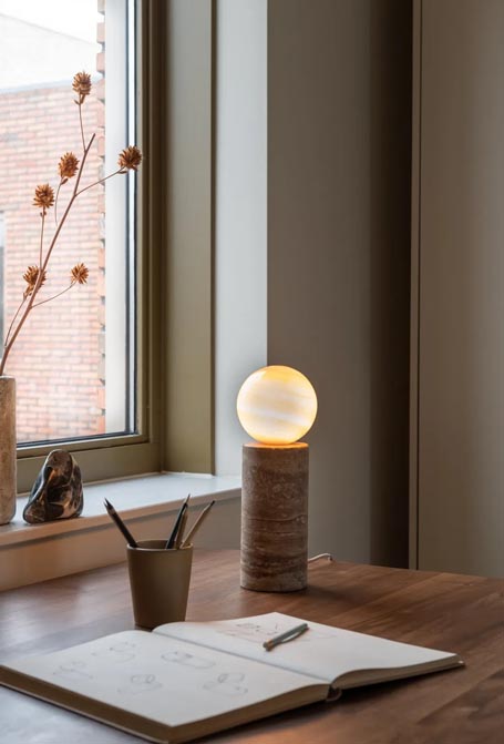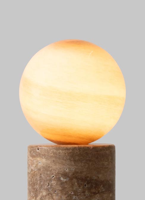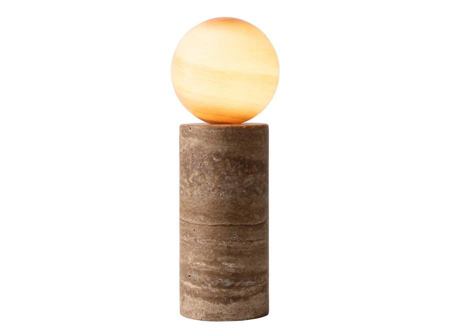 Lampa stołowa Tivoli marki It’s about Romi łączy marmur i szkło w cylindrycznym kształcie, który odzwierciedla mineralny charakter marki.