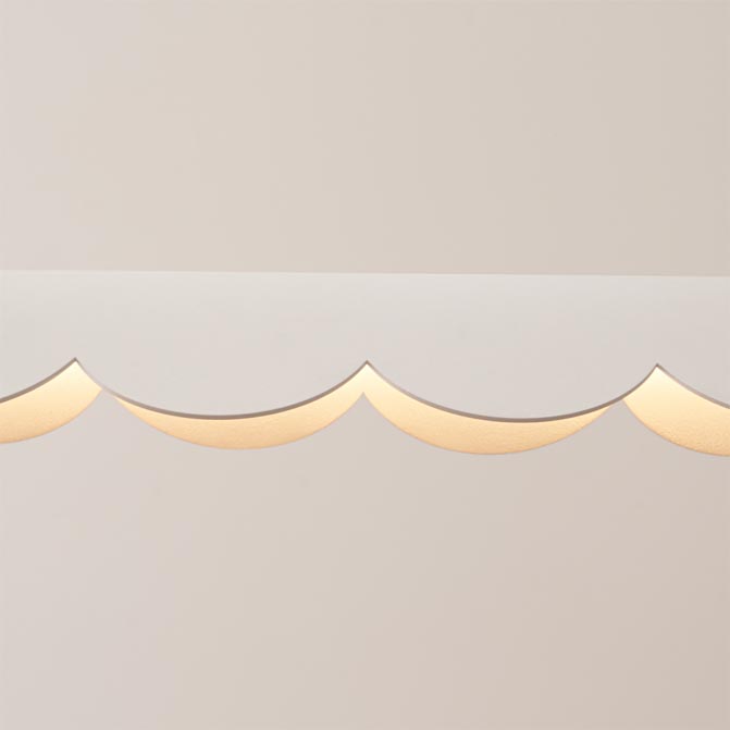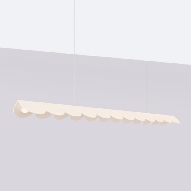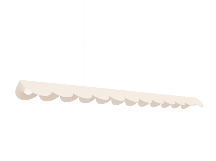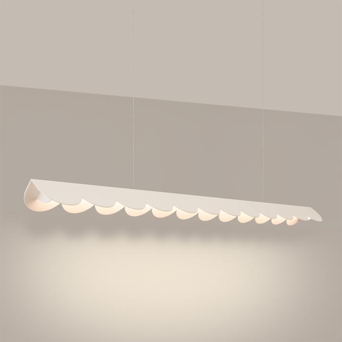 Podłużna lampa w kolorze beżowym w oryginalnym kształcie, który może nam przypominać herbatnik lub płatki kwiatów. Nowoczesna stylowa oprawa, która zapewni równomierne rozproszenie światła oraz idealnie sprawdzi się jako oświetlenie stołu oraz wyspy kuchennej; harmonijnie zintegruje się zarówno z przestrzenią roboczą gabinetu, pracowni lub biura jak i strefą relaksu i wypoczynku.