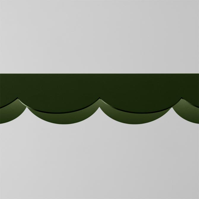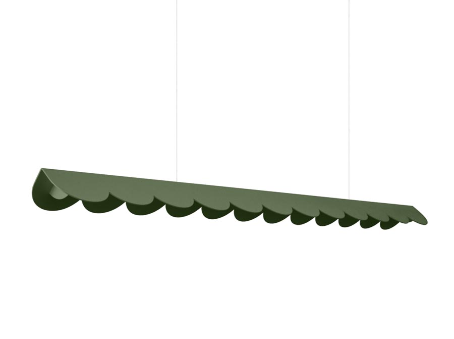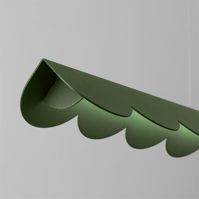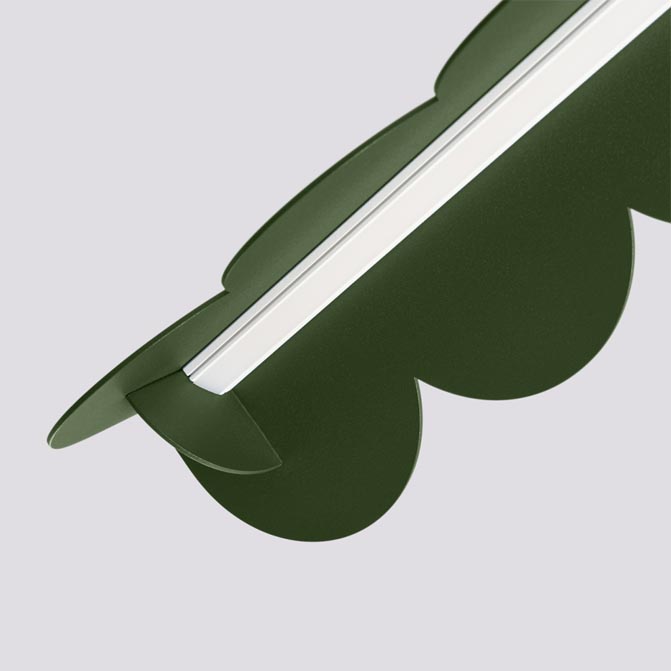 Podłużna lampa w kolorze oliwkowym w oryginalnym kształcie, który może nam przypominać herbatnik lub płatki kwiatów.