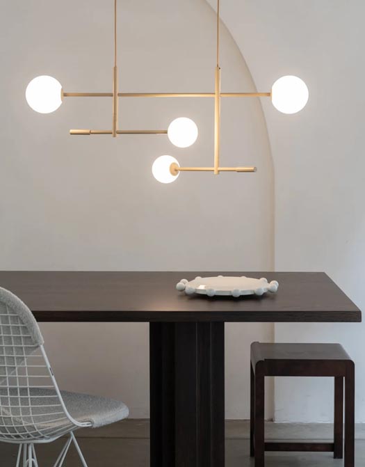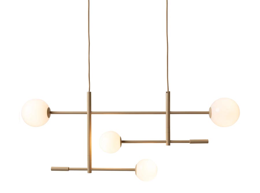Beżowa stal podkreśla finezję kompozycji, a kule nadają jej organiczny, świetlisty akcent. 1,75-metrowy kabel w oplocie linowym podkreśla jej naturalny wygląd. Zamontowana nad stołem jadalnym lub w salonie, lampa wisząca tworzy dekoracyjny punkt centralny i rozprasza miękkie światło, które optycznie powiększa przestrzeń.
