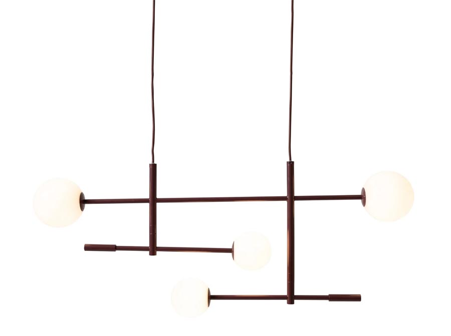 Nowoczesna lampa wisząca z charakterystycznymi białymi kulami na ramie w kolorze burgund. Jej design wyróżnia się połączeniem smukłych trzonów i czterech szklanych kul, które tworzą zwiewną, graficzną strukturę.