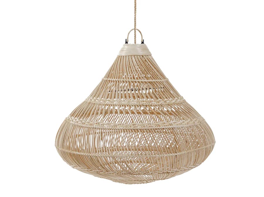 Lampa wisząca w kształcie kropli wykonana ręcznie z rattanu dostępna w dwóch rozmiarach.
