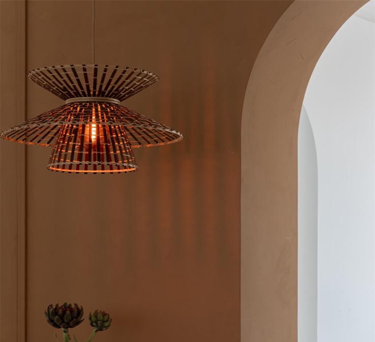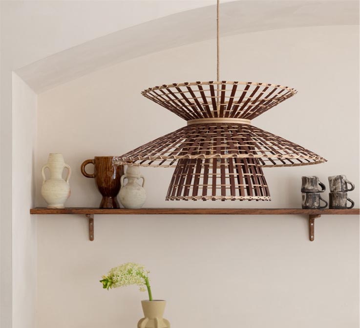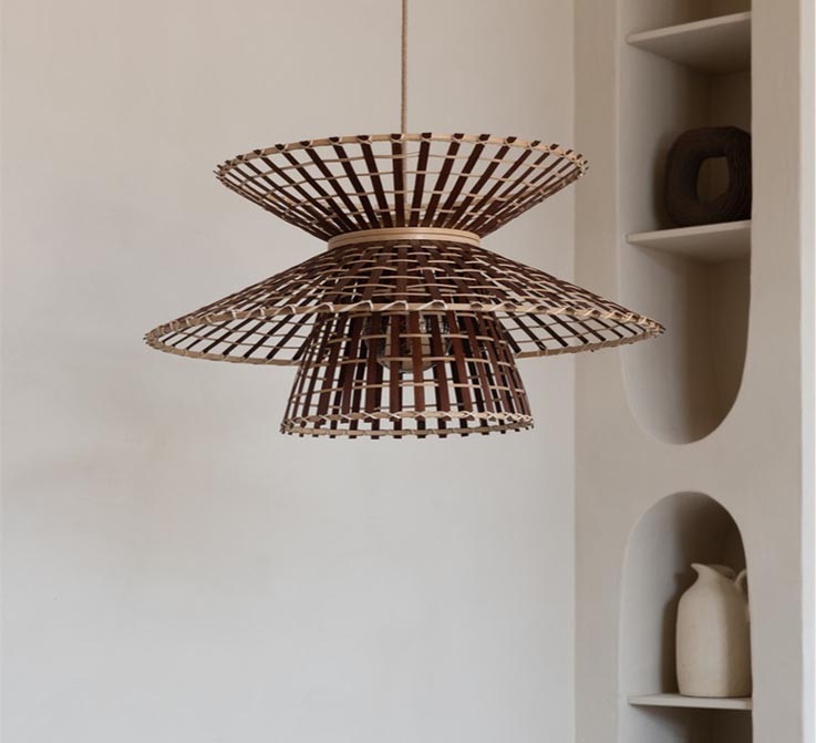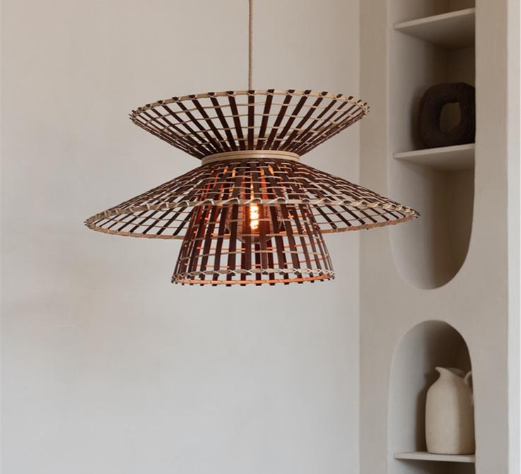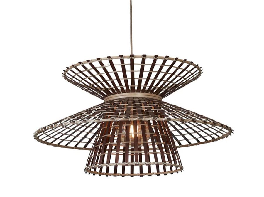 Lampa wisząca bambusowa o oryginalnym kształcie kapelusza lub fascynującej rzeźby. Zwraca uwagę połączeniem koloru naturalnego i kontrastującego ciemnego brązu. Zachwyca w każdym pomieszczeniu. Lampa wisząca idealna do sypialni, kuchni czy salonu