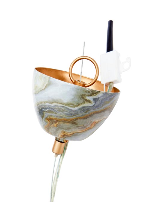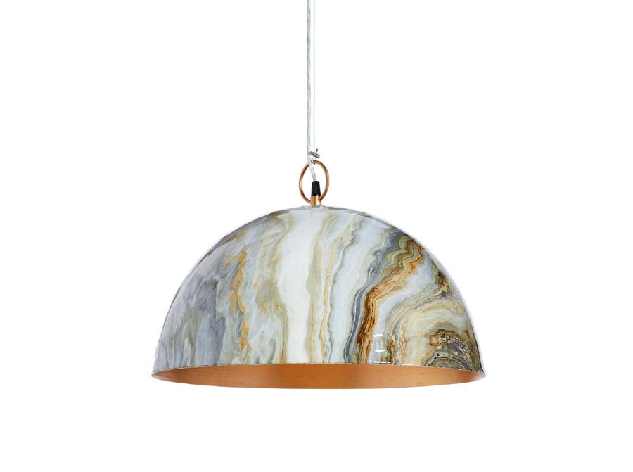 Lampa sufitowa Marnie, wykonana z metalu z dekorem w marmurkowy wzór z białymi, szarymi i złotymi tonami. Lampa nadaje luksusowy charakter i nowoczesny akcent Twojemu domowi. Lampa posiada wnętrze w kolorze złota, które roztacza ciepłą, cudowną poświatę. Źródło światła nie jest dołączone: