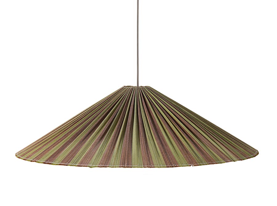 Lampa wisząca Verdura łączy plisowaną sylwetkę z wyrazistymi zielono-brązowymi paskami, nadając sufitowi fakturę i rytm. Światło delikatnie przenika przez tkaną powierzchnię, rzucając miękkie cienie i ciepły, organiczny klimat. Świeże spojrzenie na ręcznie robione oświetlenie o wyrazistej prezencji. Lampa idealna do kuchni, sypialni lub gabinetu