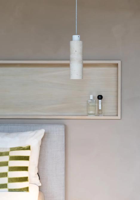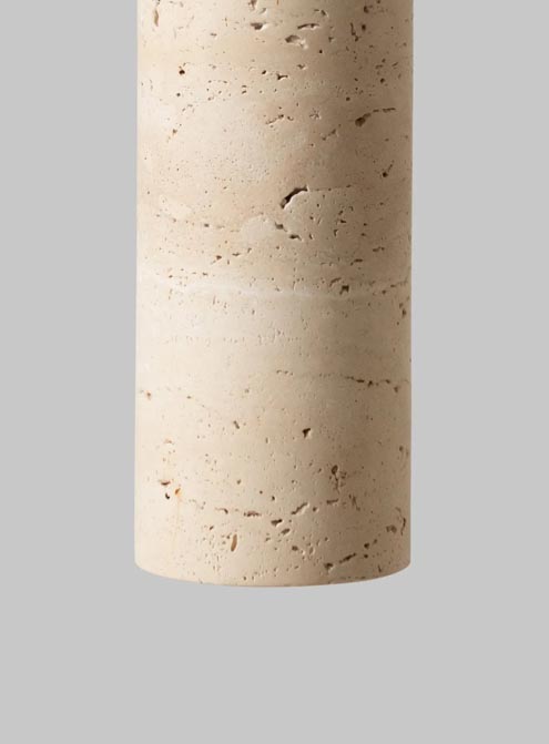 Niewielka lampa wisząca wykonana z jasnego trawertynu. Lampa wisząca eksponuje ten minerał w cylindrycznej formie. Jej barwa światła i dopasowany do niej 2,5-metrowy kabel pozwalają jej idealnie wkomponować się w wystrój kuchni, sypialni lub salonu, samodzielnie lub w kompozycji kilku elementów.