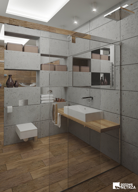 Surowa łazienka stworzona przez naszą projektantkę z użyciem betonu atchitektonicznego i gresu imitującego wygląd i strukturę drewna. Nowoczesna, minimalistyczna łazienka o powierzchni 5 m2 (nasza projektantka może stworzyć taką łazienkę również na dowolnej przestrzeni). Łazienka z betonu architektonicznego i drewna to najnowszy trend w aranżacji wnętrz. Stworzone wnętrze jest ponadczasowe. Ceramika użyta w projekcie ma ostre krawędzie, co nadaje charakter wnętrzu. Duże drzwi prysznicowe z odpływem – bez brodzika nadają wnętrzu przestrzeni i funkcjonalności. Półki stworzone przy użyciu betonu architektonicznego i lustra potęgują ten efekt.