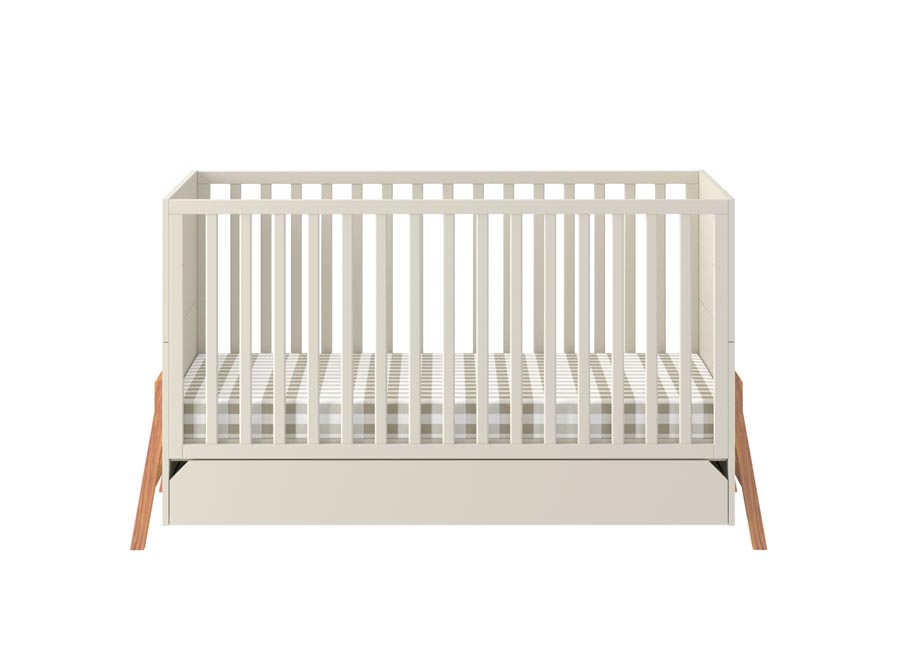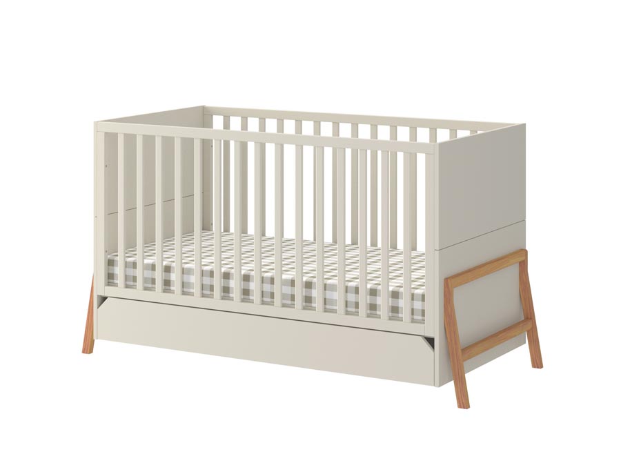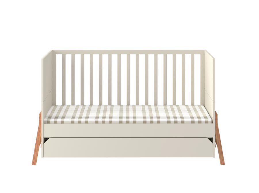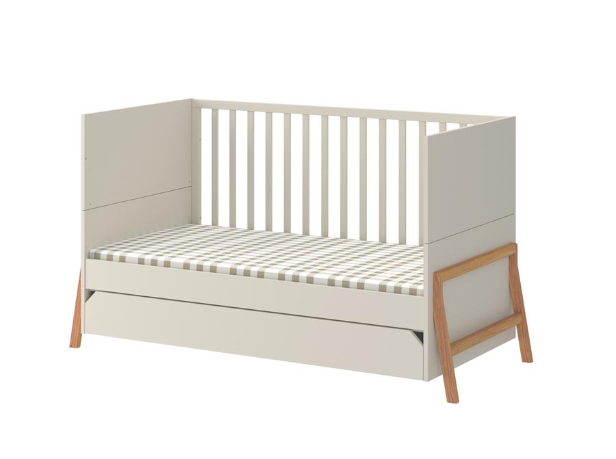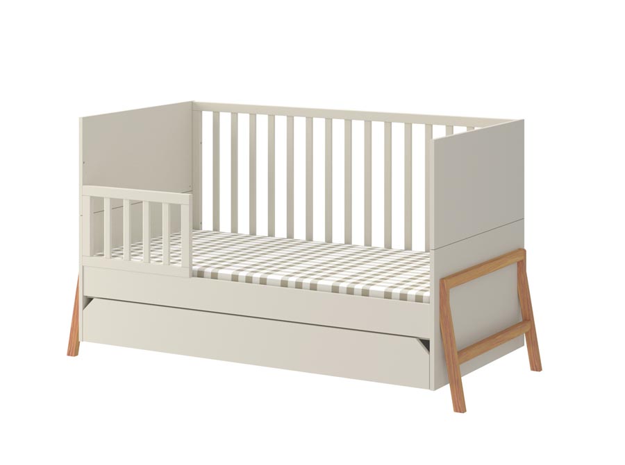 Łóżeczko z szufladą z kolekcji Lotta z możliwością zmiany w sofkę dla starszego dziecka w kolorze latte. Wyposażone w pojemną szufladę na pościel. Do łóżeczka można dokupić barierkę zabezpieczającą. Wpisz w uwagach przy zamówieniu