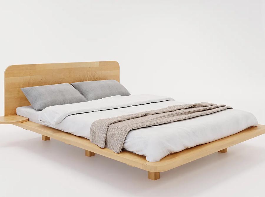 Nowoczesne łóżko drewniane w stylu japandi. Niezwykle lekkie w formie, sprawia wrażenie jakby unosiło się nad ziemią.