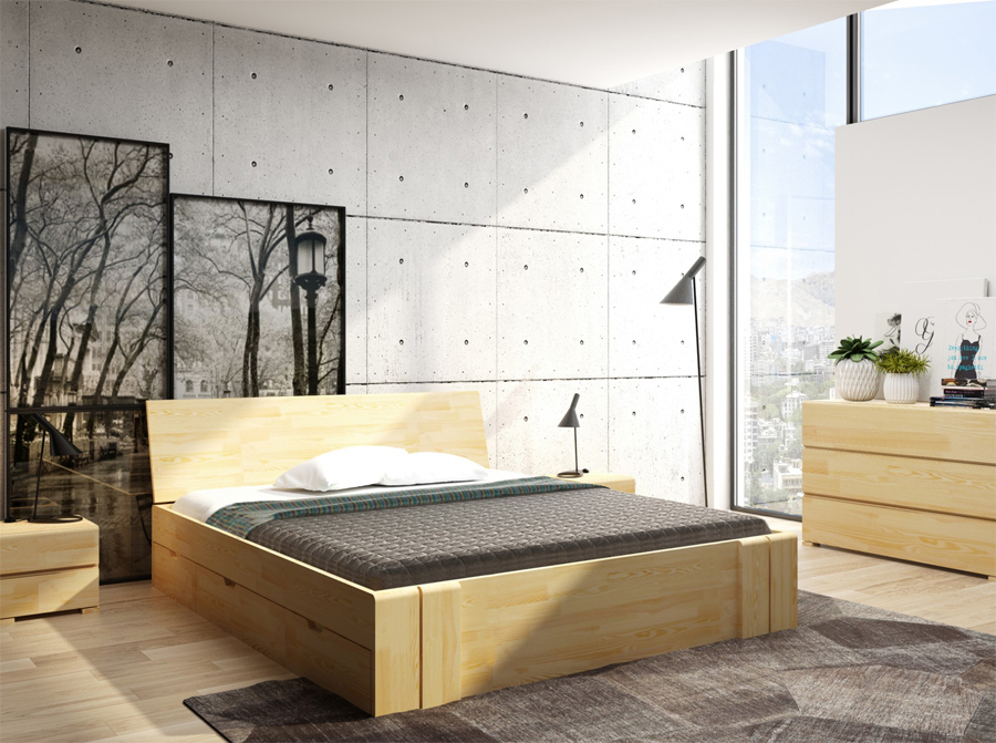 Niebanalne i nowoczesne łóżko drewniane z szufladą na pościel. Polski produkt objęty 8 letnią gwarancją. Łóżko powstało z drewna sosnowego (możliwość zamówienia również w drewnie bukowym). Ponadczasowy kształt sprawia, że pasuje zarówno do nowoczesnej jak i klasycznej, przytulnej sypialni. Zachwyca naturalną urodą drewna