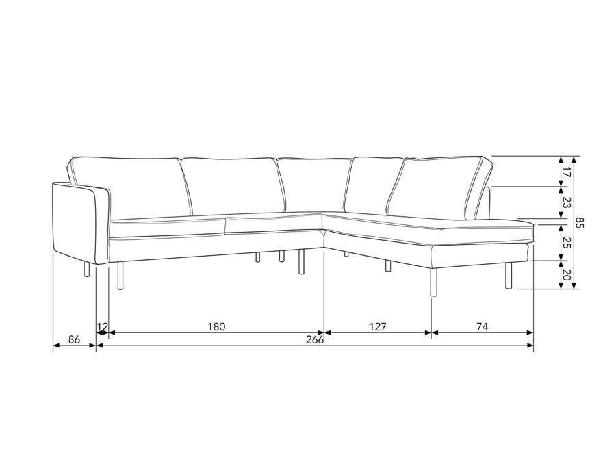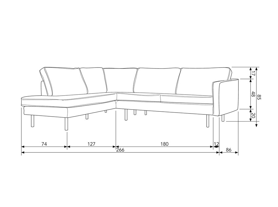 Przestronny narożnik ma całkowitą wysokość 85 cm, szerokość 266 cm i głębokość 86 cm. Całkowita głębokość sekcji narożnej wynosi 213 cm. Wysokość siedziska wynosi 45 cm, a głębokość 60 cm, co zapewnia doskonałe podparcie. Szerokość siedziska między podłokietnikiem a poduszką narożną wynosi 266 cm i jest podzielona na trzy oddzielne poduszki siedziska i oparcia. Podłokietniki mają szerokość 12 cm i wysokość 68 cm, mierząc od podłogi. Metalowe nogi mają 20 cm wysokości. Sofa może udźwignąć 250 kg przy równomiernym rozłożeniu.