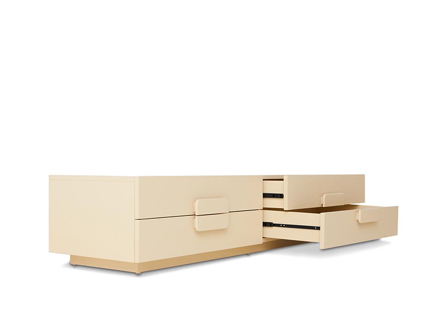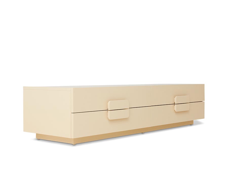 Drewniana szafka w kolorze kremowym idealna do salonu jak i sypialni. Szafka sprawdzi się również jako szafka na telewizor. Przestronne szuflady zapewniają dużo miejsca do przechowywania niezbędnych rzeczy, a charakterystyczne kwadratowe uchwyty dodają nowoczesnego akcentu. Idealna do salonu, ta szafka idealnie komponuje się z różnymi stylami wnętrz, zapewniając wyrafinowane i praktyczne rozwiązanie dla Twojego domu.
