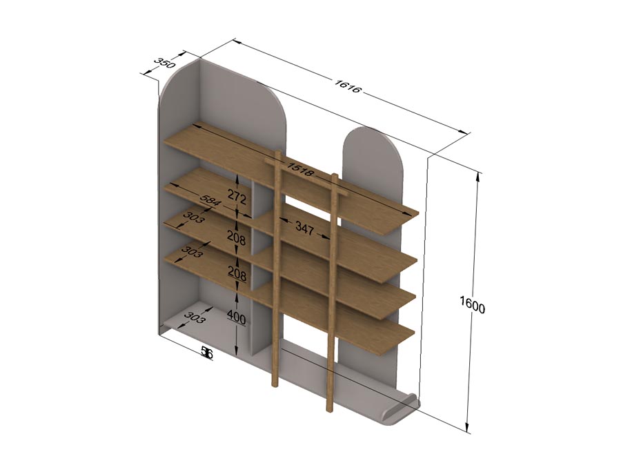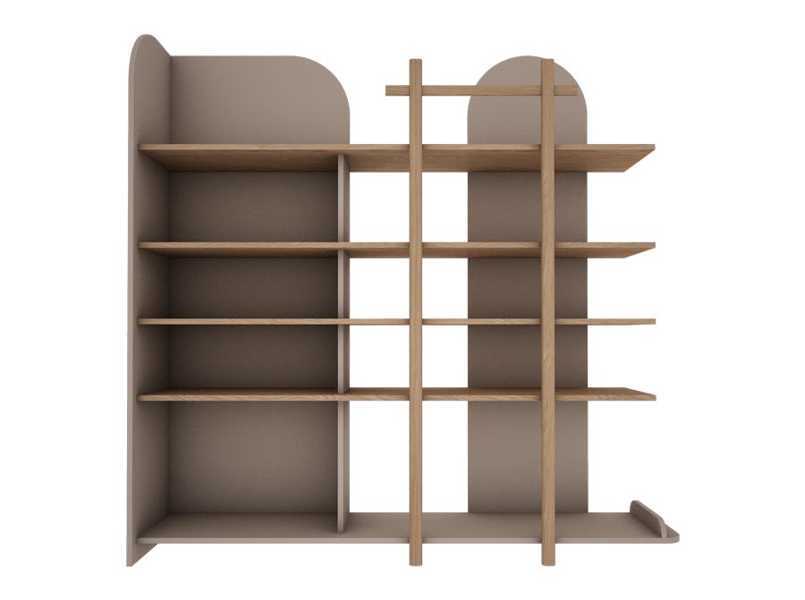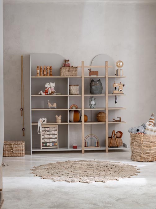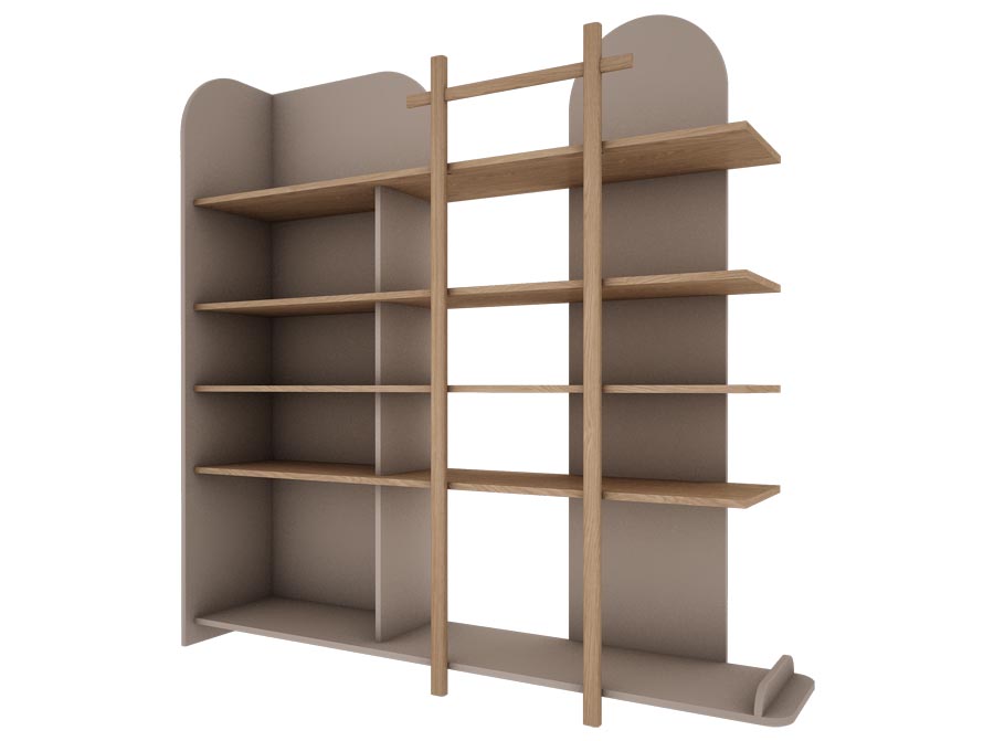 Duży regał do pokoju dziecka z oryginalnymi łukami. Ciepło w odcieniu drewna dębu połączone z łukami w kolorze kaszmir. Ponadczasowy design do pokoju dzieci i młodzieży.