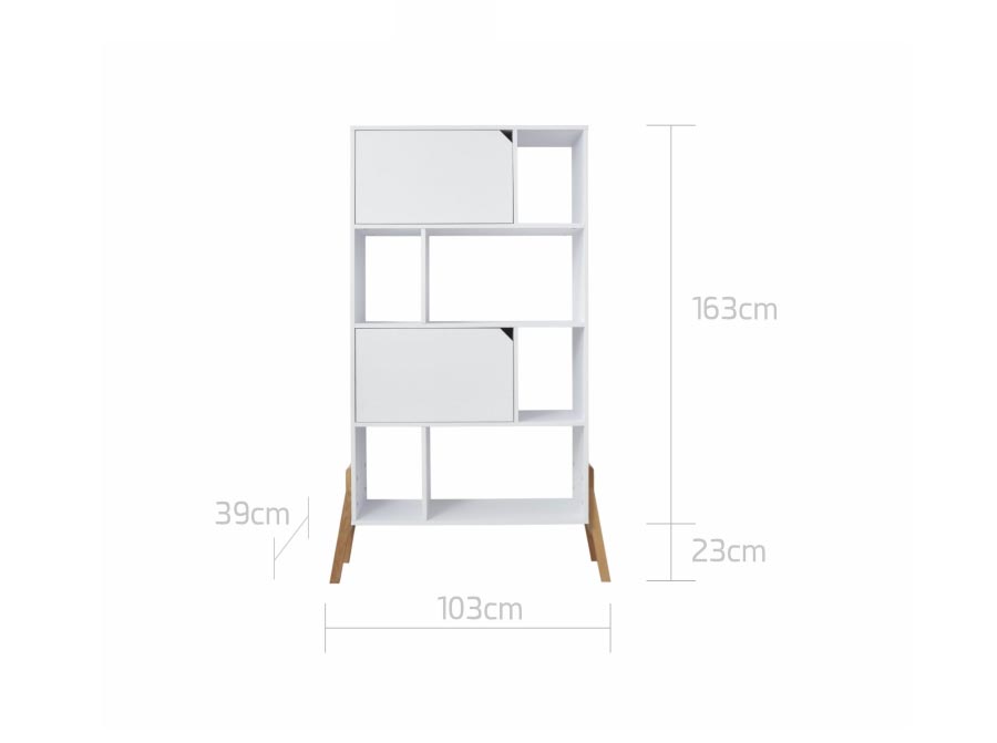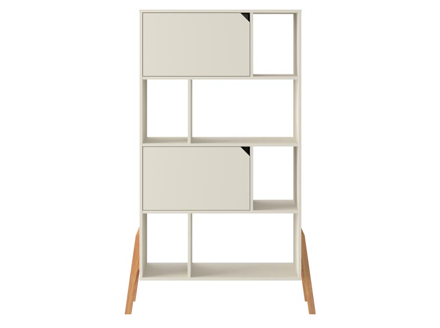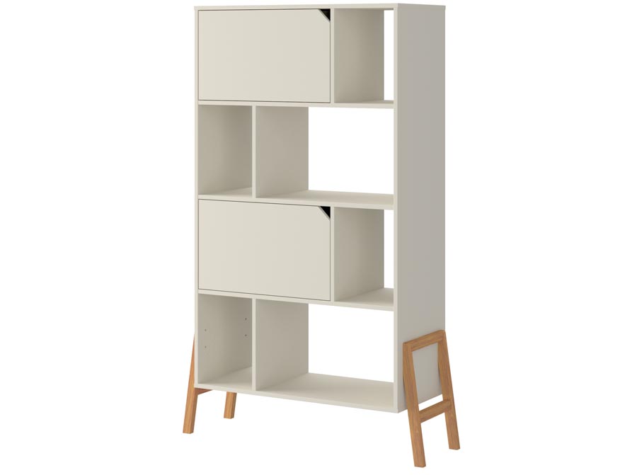 Nowoczesny regał w stylu skandynawskim stworzony do pokoju dziecka, nastolatka lub salonu. Zachwyca wyglądem i jakością wykonania. Przykuwa uwagę drewnianą podstawą wykonaną z drewna dębu