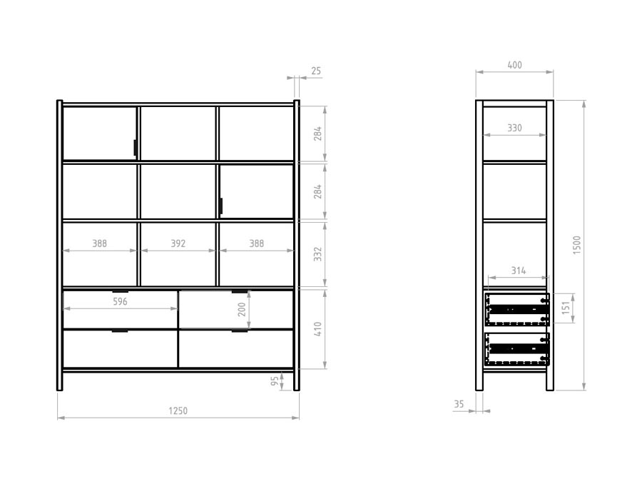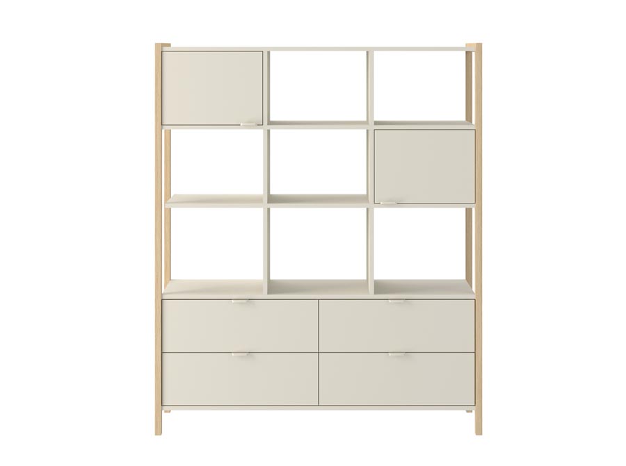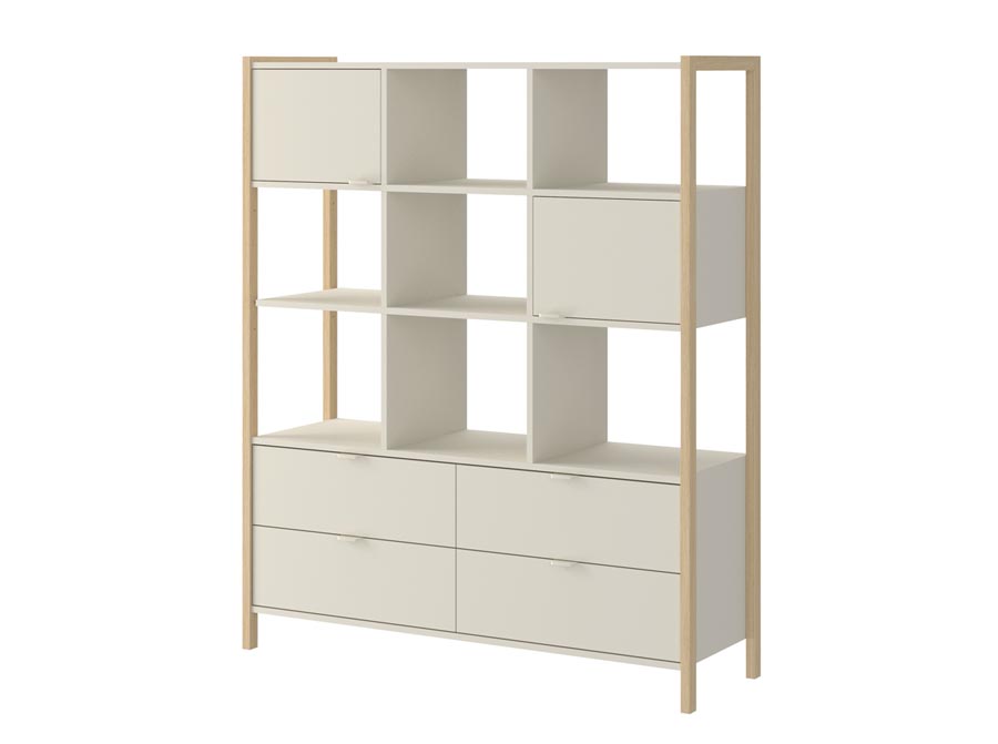 Wyposażony w cztery praktyczne szuflady, dwie zamykane szafki oraz otwarte półki, pozwala na wygodne uporządkowanie książek, zeszytów, gier, dekoracji czy akcesoriów szkolnych.