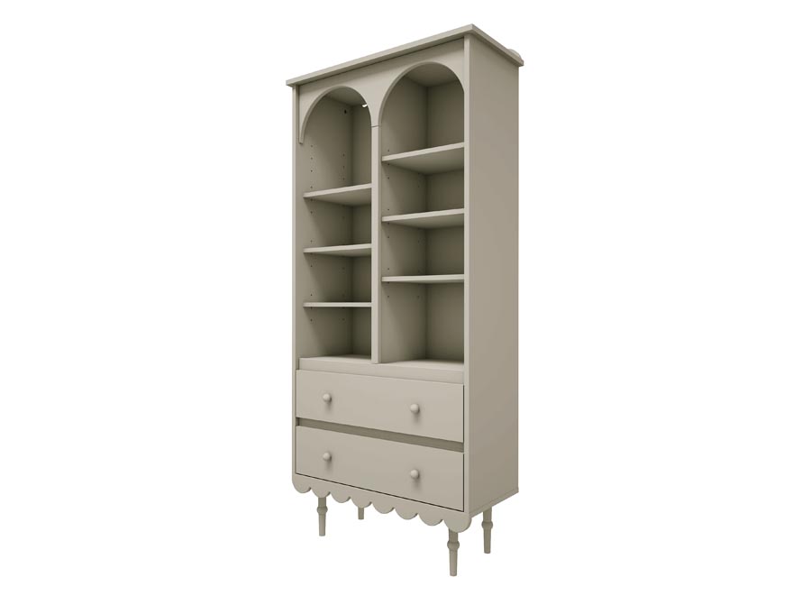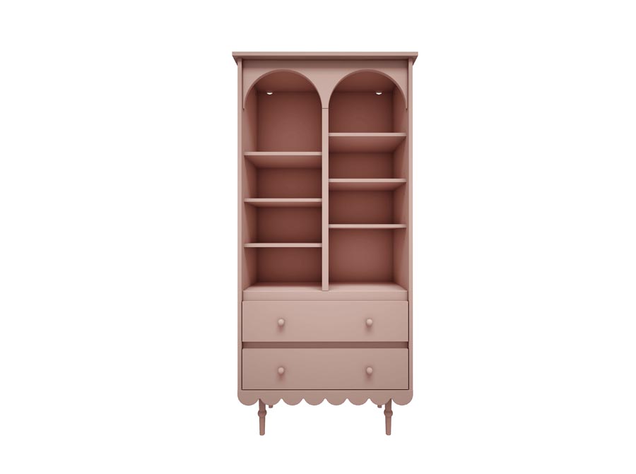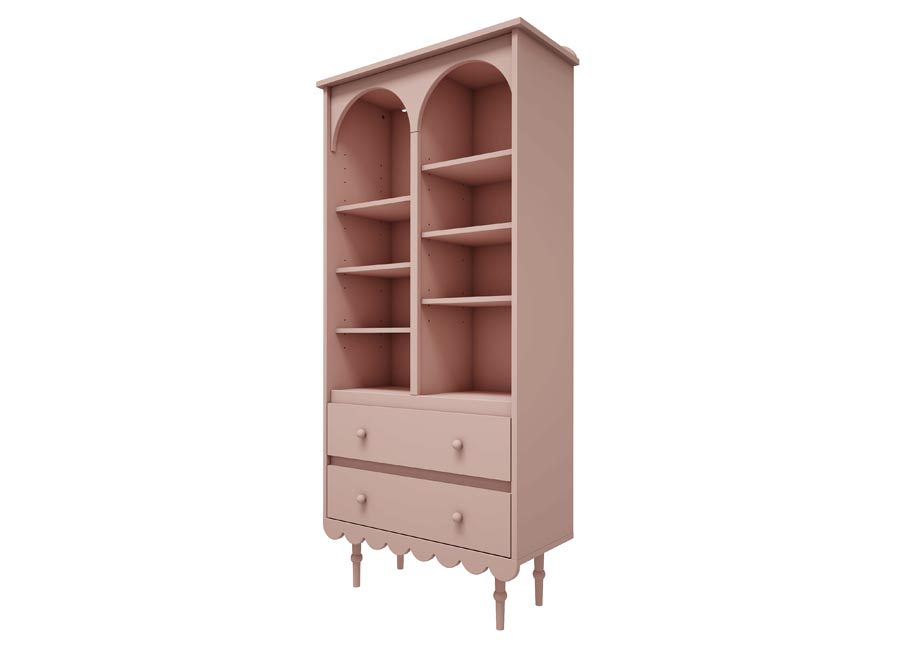 Regał w stylu retro z charakterystyczną falbanką dostępny jest w trzech kolorach: białym, różowym oraz oliwkowym, wybierasz w opcjach przy produkcie.