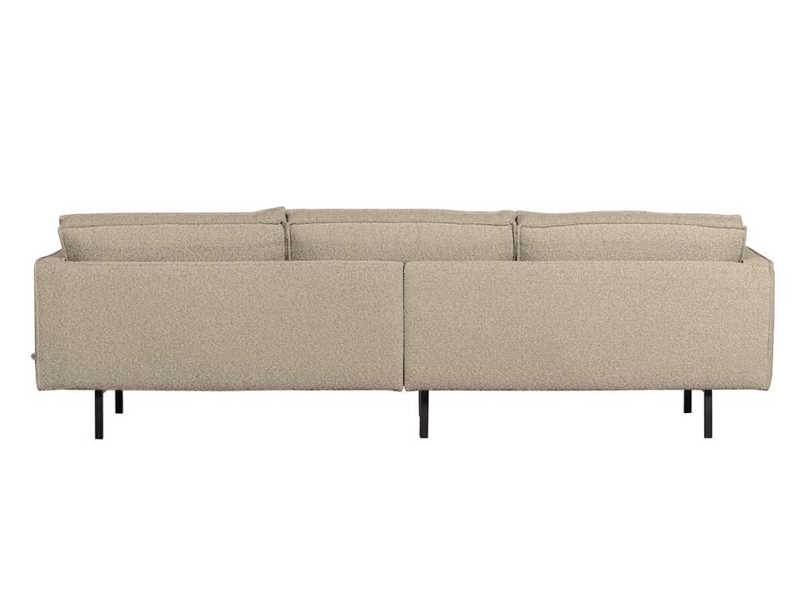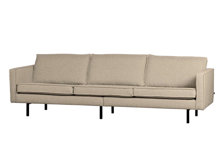 Sofa Rodeo inspirowana latami 50-tymi z nowoczesnym akcentem. Miękka tkanina bucle w kolorze beżowym wprowadza harmonię do naszego domu