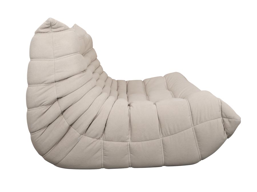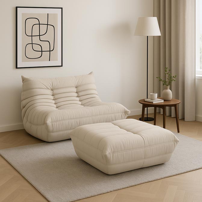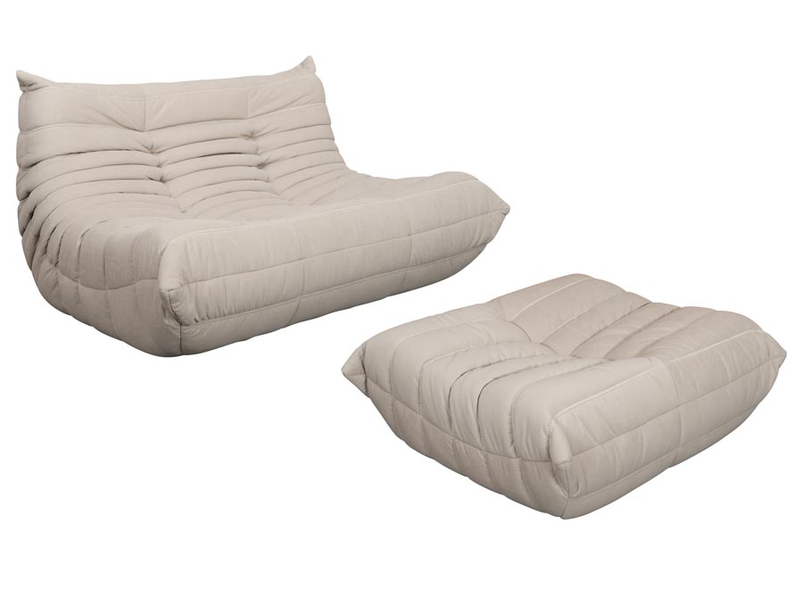 Nowoczesna sofa dwuosobowa typu lounge w kolorze beżowym. Komfort gwarantowany. Dodatkowo komplet zawiera podnóżek dla jeszcze większego komfortu użytkowania