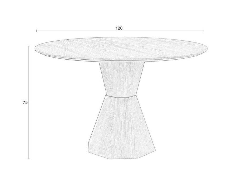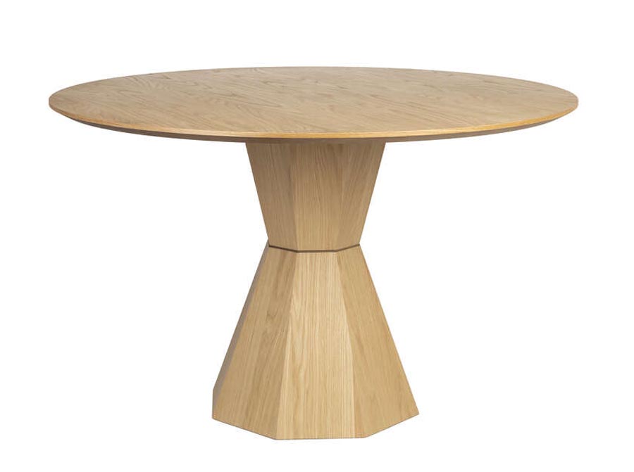 Kanciasta noga stołu o czystych liniach tworzy idealny kontrast z okrągłym blatem.