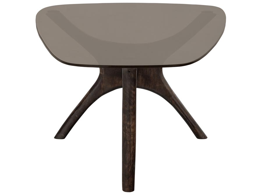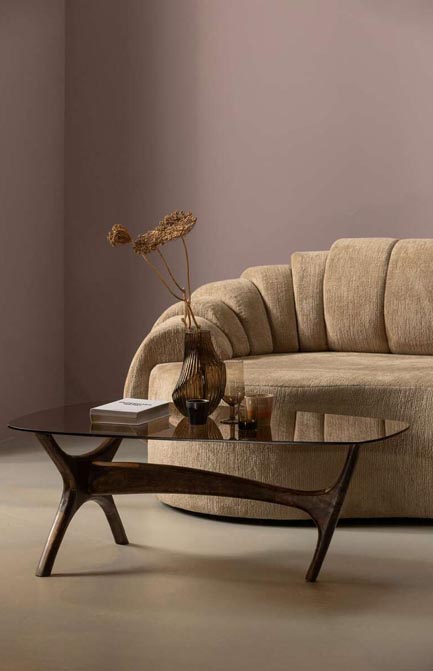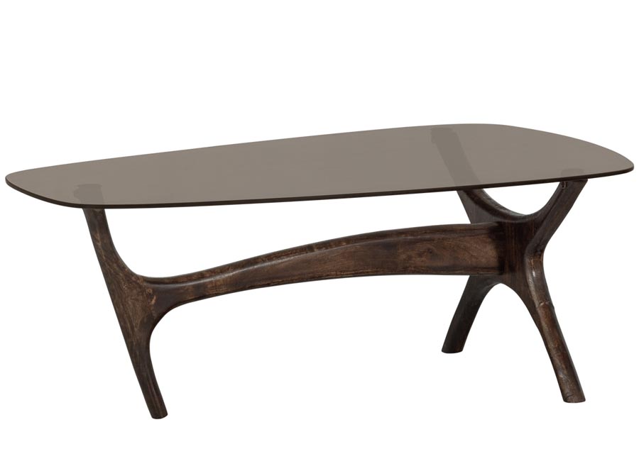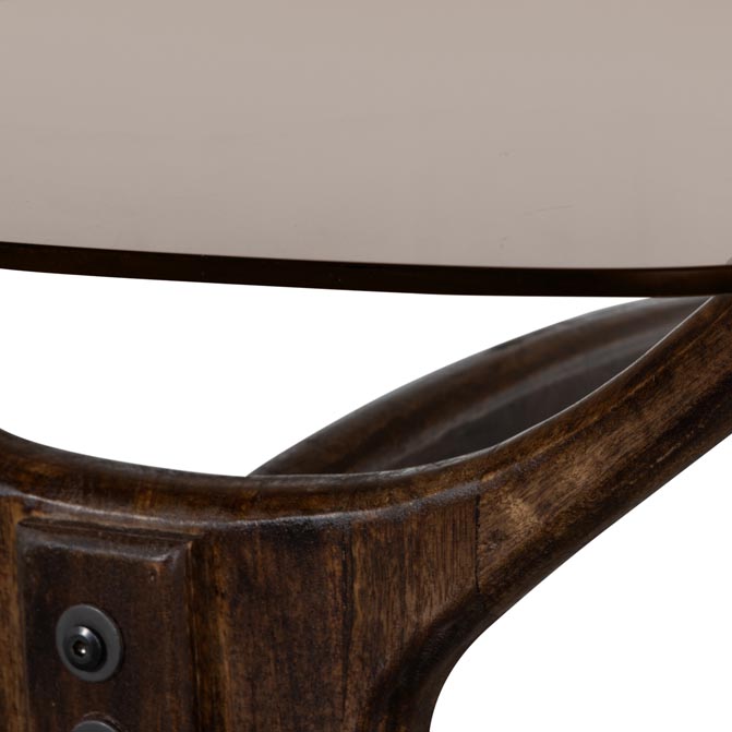 Stolik kawowy o organicznym kształcie na podstawie z drewna mango ze szklanym blatem. Organicznie ukształtowana noga zapewnia stabilną postawę i zapewnia spokojny wygląd. Blat stolika jest subtelnie zwężany, dodając luksusowy akcent. Szkło znajdujące się w naszych kolekcjach ma różne kształty. Barwienie szkła przezroczystego odbywa się już na wczesnym etapie, nieprzezroczyste zabarwienie szkła następuje po całkowitym uformowaniu przedmiotu. W naszych technikach koloryzacji zawsze stosujemy barwniki organiczne.