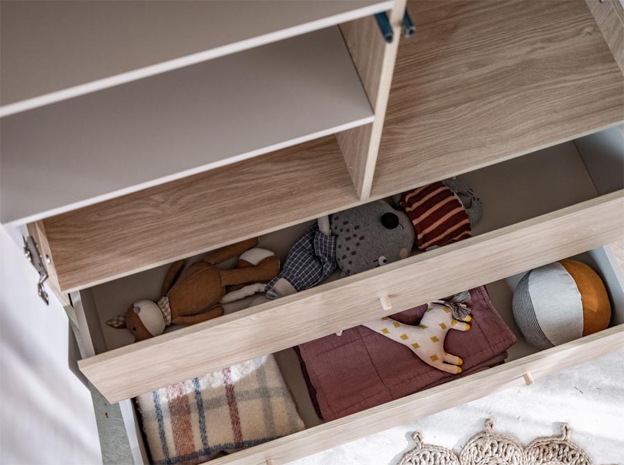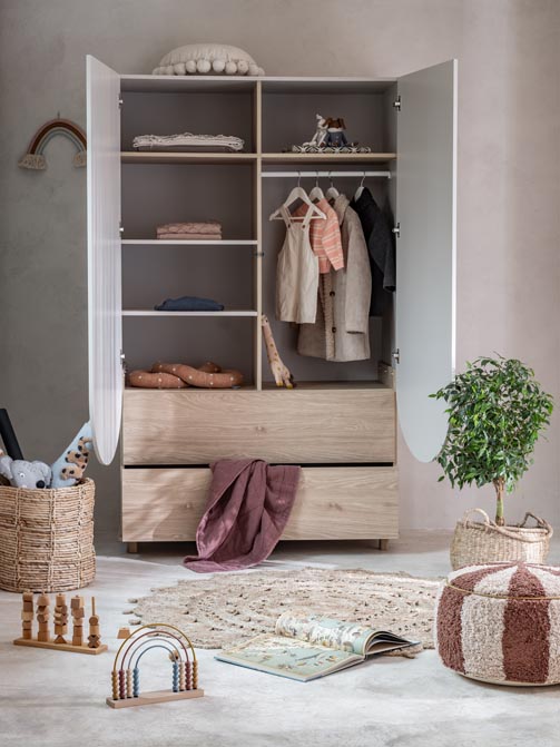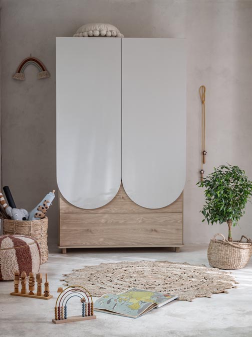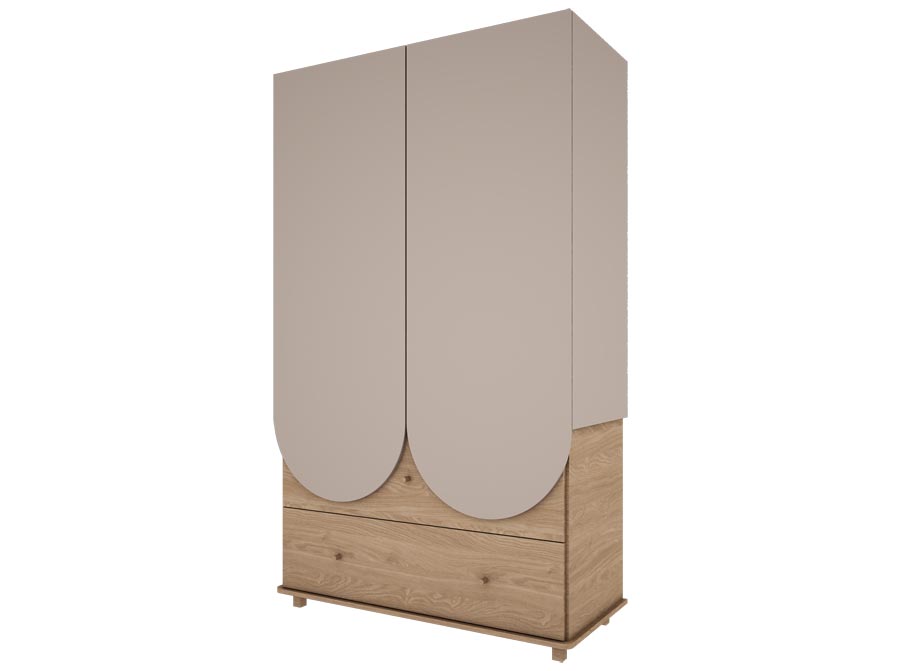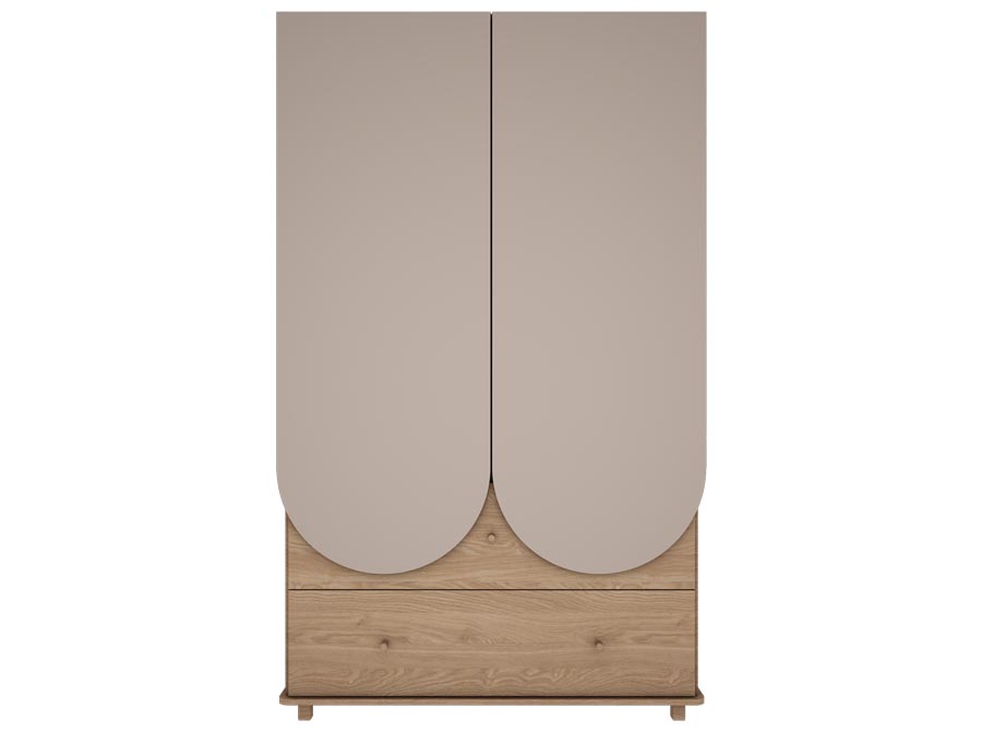 Oryginalna, duża szafa do pokoju dziecka. Ciepło w odcieniu drewna dębu połączone z łukami w kolorze kaszmir. Ponadczasowy design do pokoju dzieci i młodzieży.