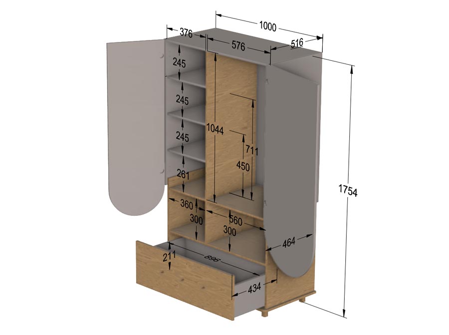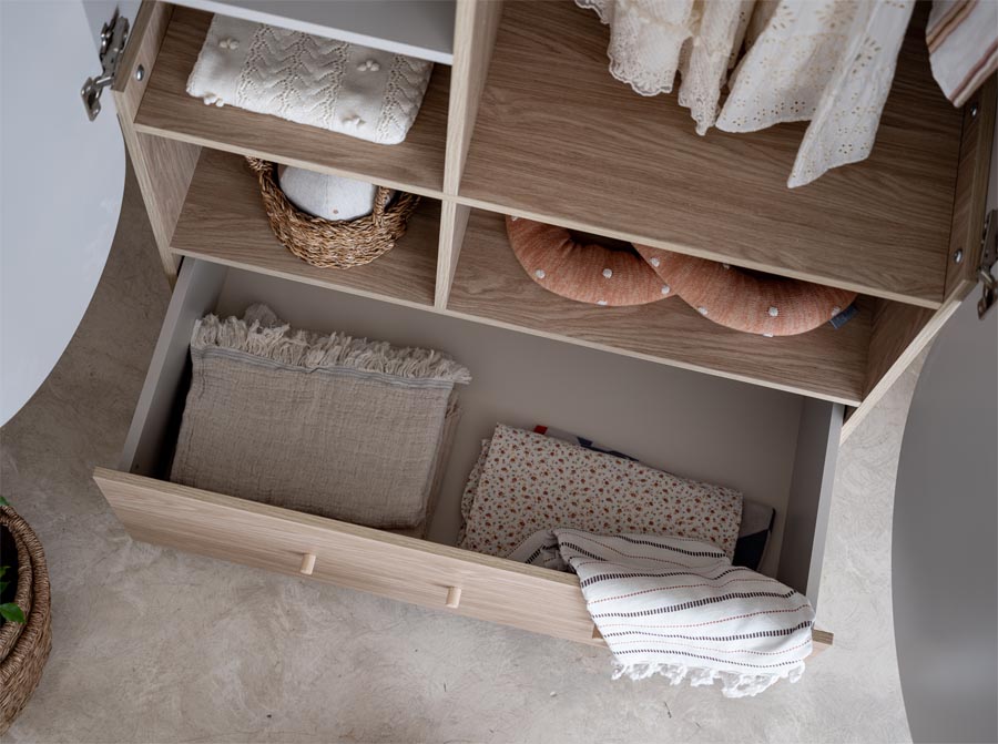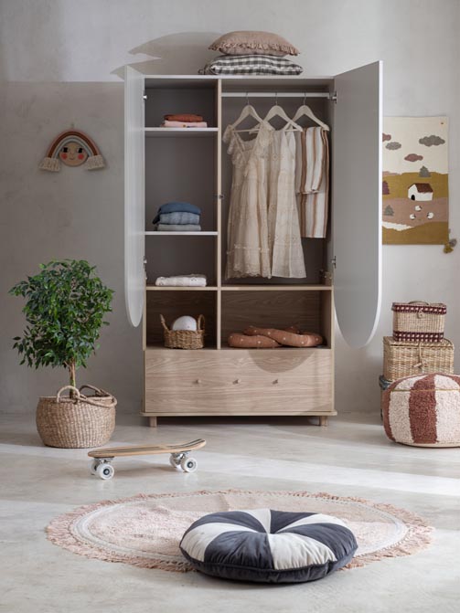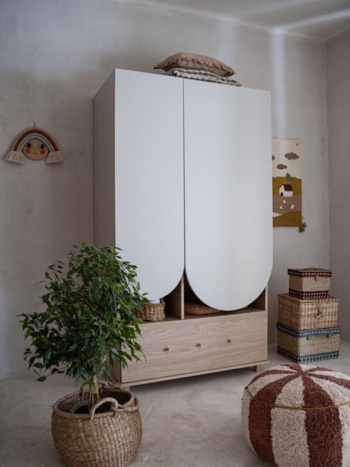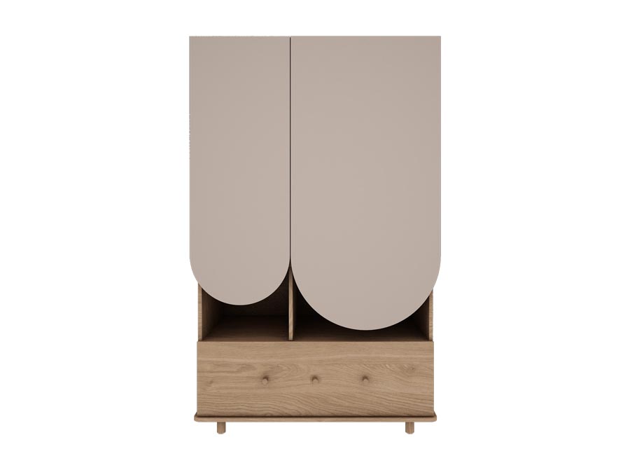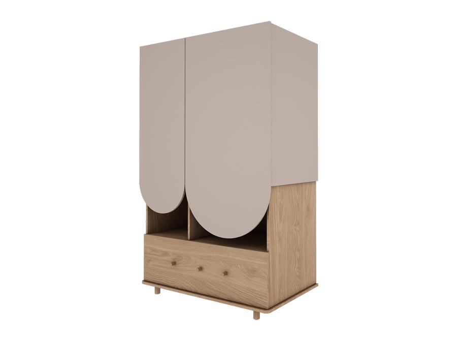 Oryginalna szafa do pokoju dziecka. Ciepło w odcieniu drewna dębu połączone z łukami w kolorze kaszmir. Ponadczasowy design do pokoju dzieci i młodzieży. Szafa ma drążek na ubranka wiszące, pojemne półki i dużą szufladę. Gałki w stylu retro dodają klimatu vintage.