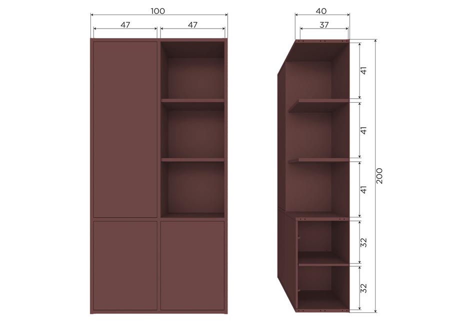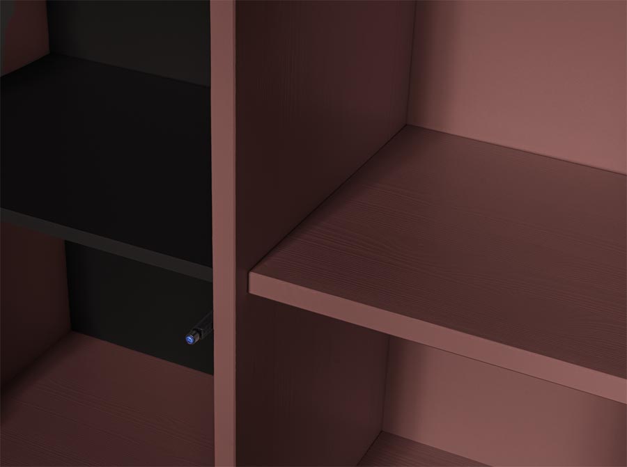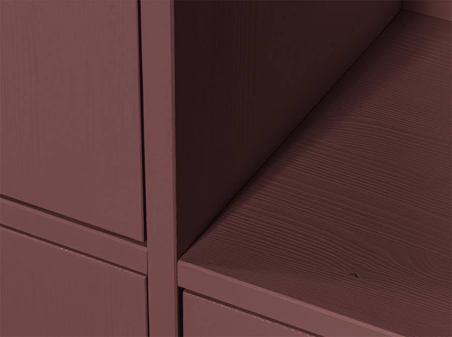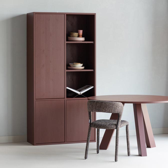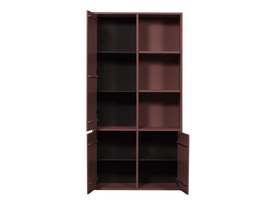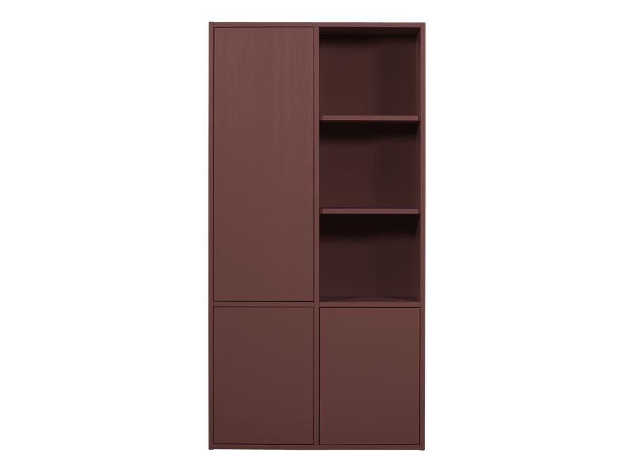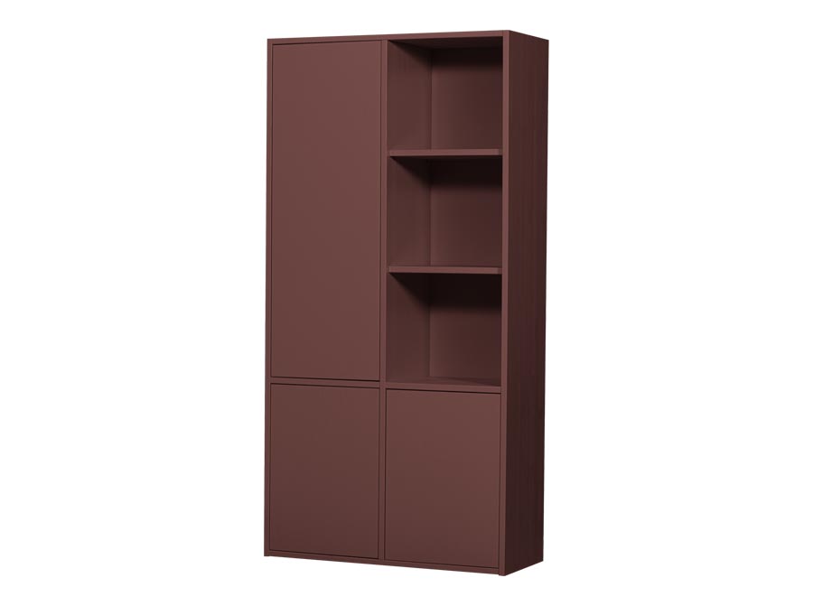 Wysoka szafka w kolorze burgundowym. Stylowa, ponadczasowa i nowoczesna. To właśnie te słowa definiują szafkę Merel. Wykonana jest z naturalnego drewna sosnowego. W prawym górnym rogu szafki Merel znajdują się dwa panele z drewna sosnowego. Panele za drzwiami wykonane są z płyty wiórowej. Elegancki design szafki Merel nie jest zakłócony przez uchwyty; dzięki nowoczesnemu systemowi otwierania typu push-to-open drzwi otwierają się i zamykają bezgłośnie.