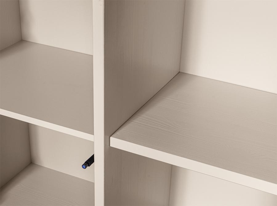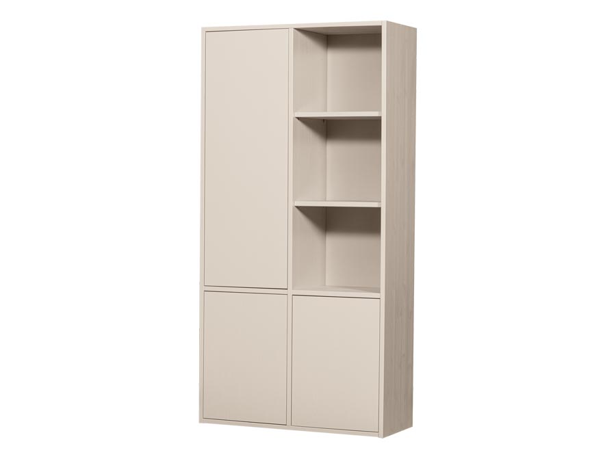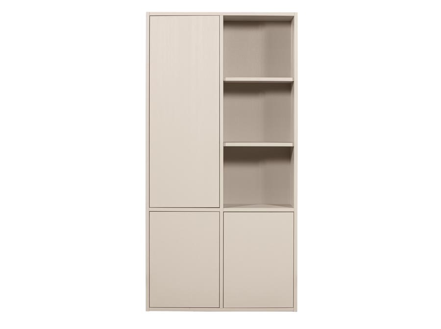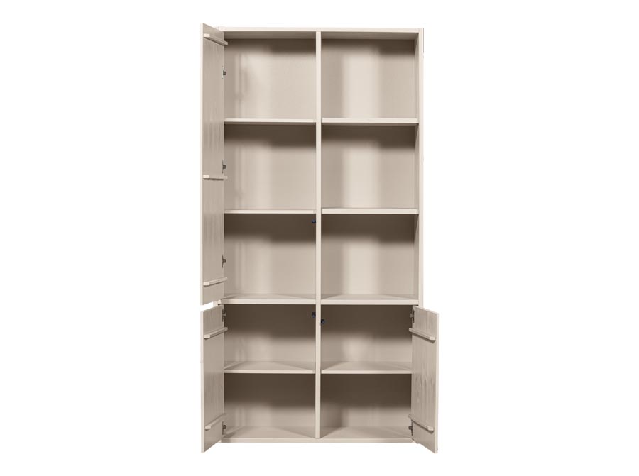 Wysoka szafka w kolorze kremowym. Stylowa, ponadczasowa i nowoczesna. To właśnie te słowa definiują szafkę Merel. Wykonana jest z naturalnego drewna sosnowego. W prawym górnym rogu szafki Merel znajdują się dwa panele z drewna sosnowego. Panele za drzwiami wykonane są z płyty wiórowej. Elegancki design szafki Merel nie jest zakłócony przez uchwyty; dzięki nowoczesnemu systemowi otwierania typu push-to-open drzwi otwierają się i zamykają bezgłośnie.