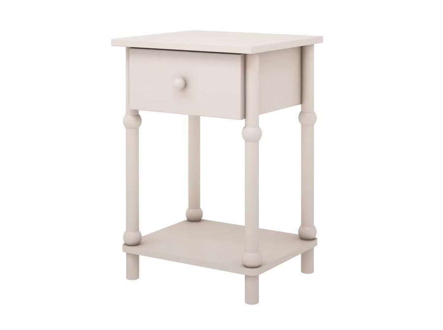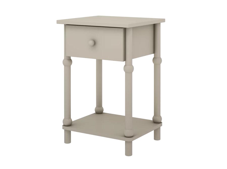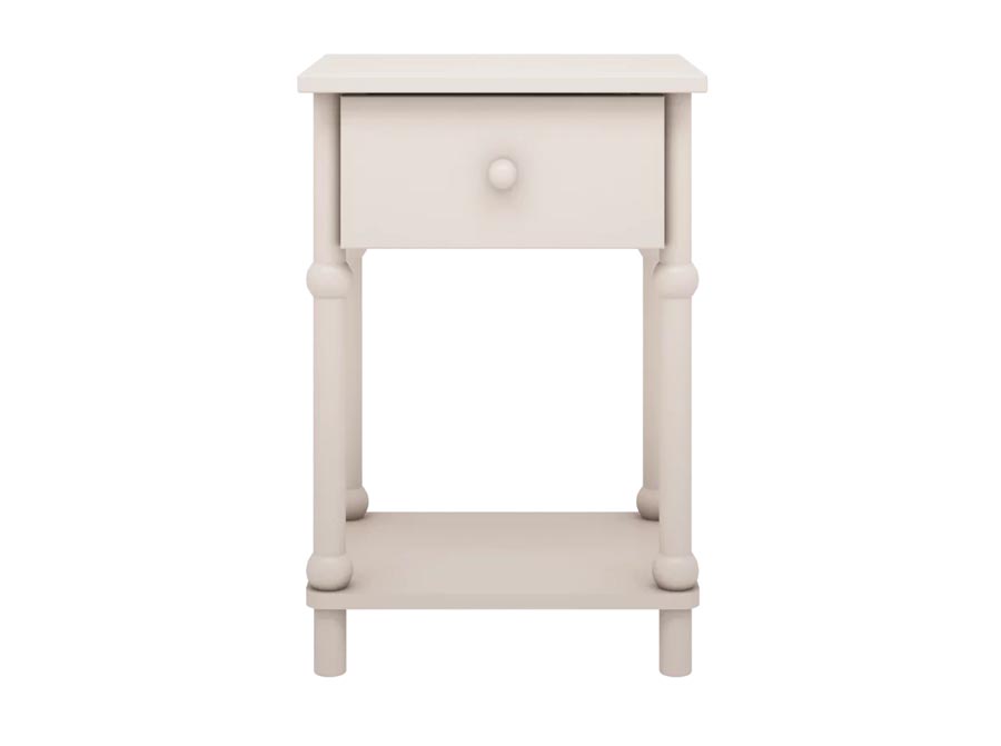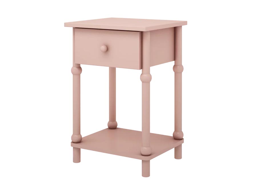 Szafka nocna w stylu vintage dostępna w trzech kolorach: białym, oliwkowym i pastelowym różowym. Pasuje do pokoju dziecięcego jak i sypialni. Mała szufladka i półeczka jest bardzo funkcjonalna szczególnie przy łóżku w sypialni.